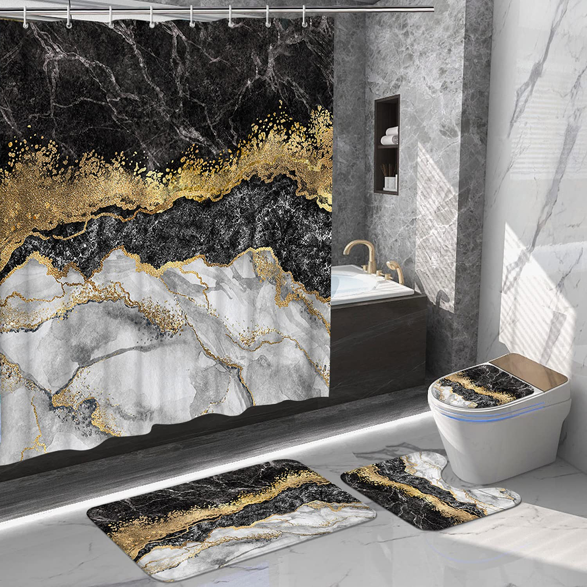 Dznils 4 Pcs Marble Shower Curtain Sets with Rugs, Modern Bathroom Sets, 12 Hooks, 72″ x 72″, Black