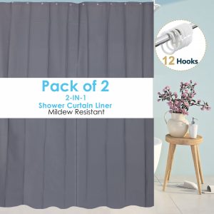 Dznils Extra Long Gray PEVA Shower Curtain Liner with Hooks Mildew Resistant, 70″ W x 78″ H, 2 Pack
