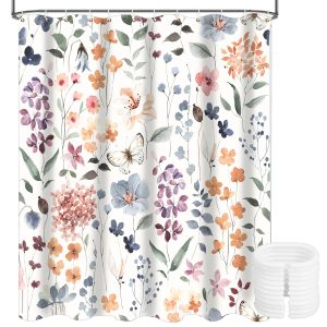 Dznils Floral Shower Curtain with Hooks, Modern Watercolor Fabric Bathroom Curtain, Blue, 72″ x 72″