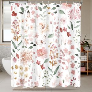 Dznils Floral Shower Curtain with Hooks, Modern Watercolor Fabric Bathroom Curtain, Pink, 72″ x 72″