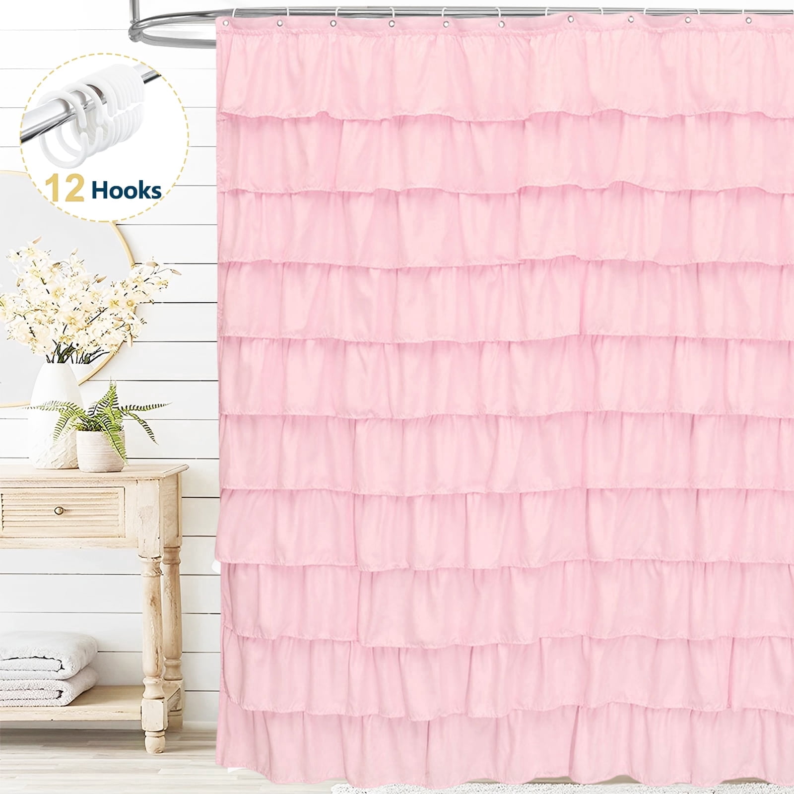 Dznils Pink Ruffle Shower Curtain with Hooks, Farmhouse Fabric Bathroom Curtain, 72″ x 72″