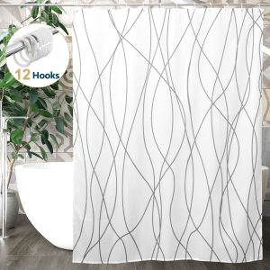 Dznils Striped Fabric Shower Curtain, Gray and White Modern Minimalist with Hooks, 72″ x 72″