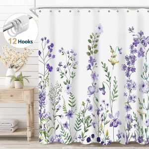 Dznils White Floral Fabric Shower Curtain, Watercolor Bathroom Curtain with Hooks, Purple, 72″ x 72″
