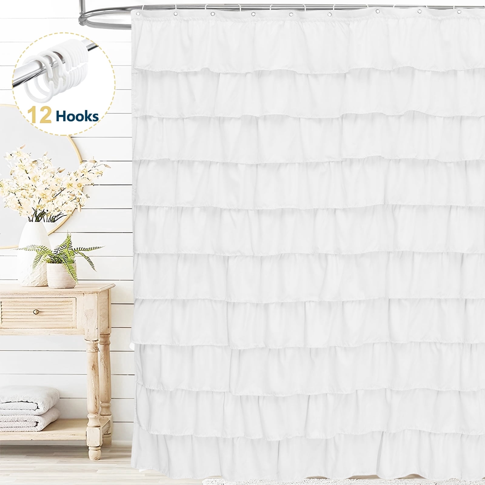 Dznils White Ruffle Shower Curtain with Hooks, Farmhouse Fabric Bathroom Curtain, 72″ x 72″