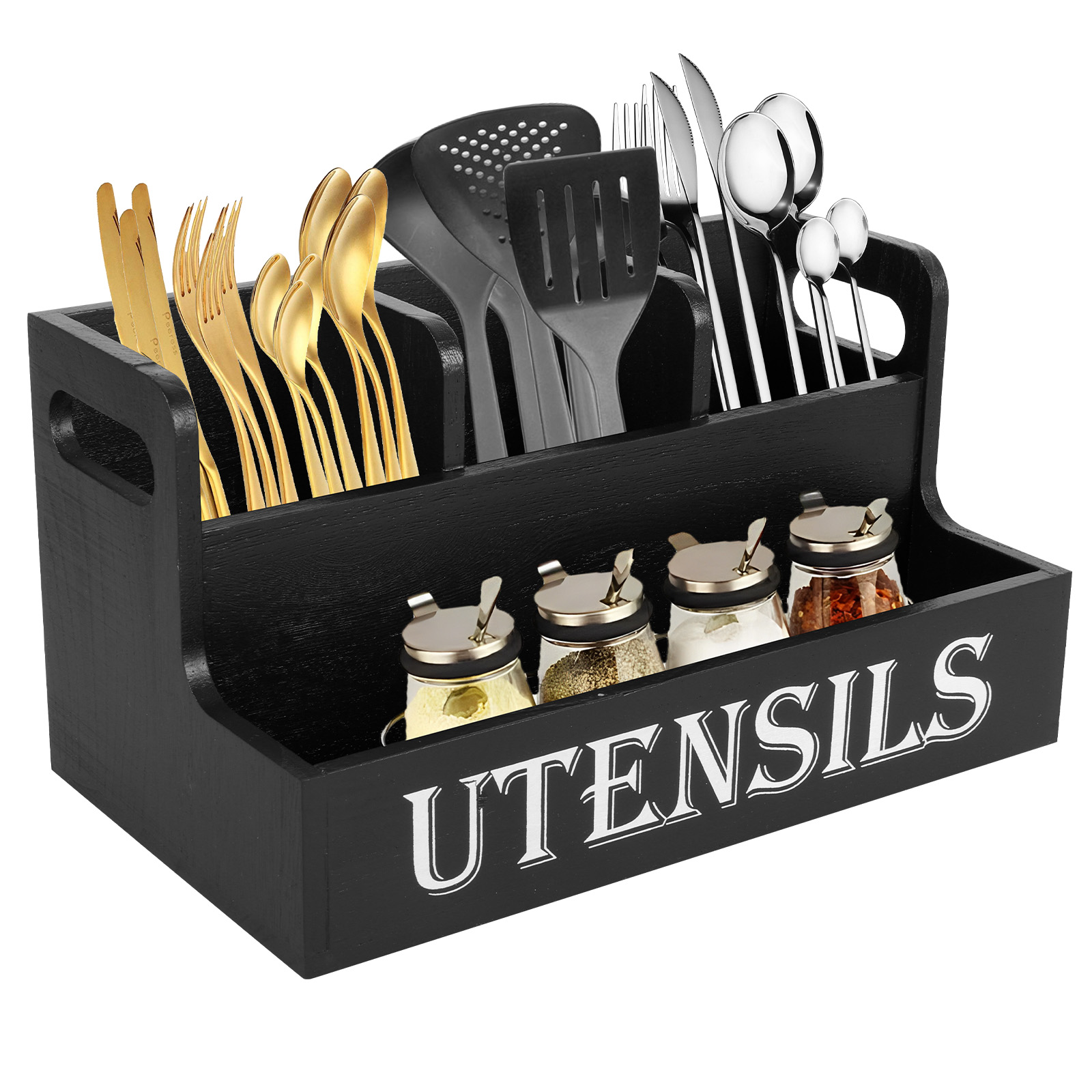 – The solid wood utensil holder works great as a storage shelf for spices, condiment bottles, and cooking utensils in the kitchen.