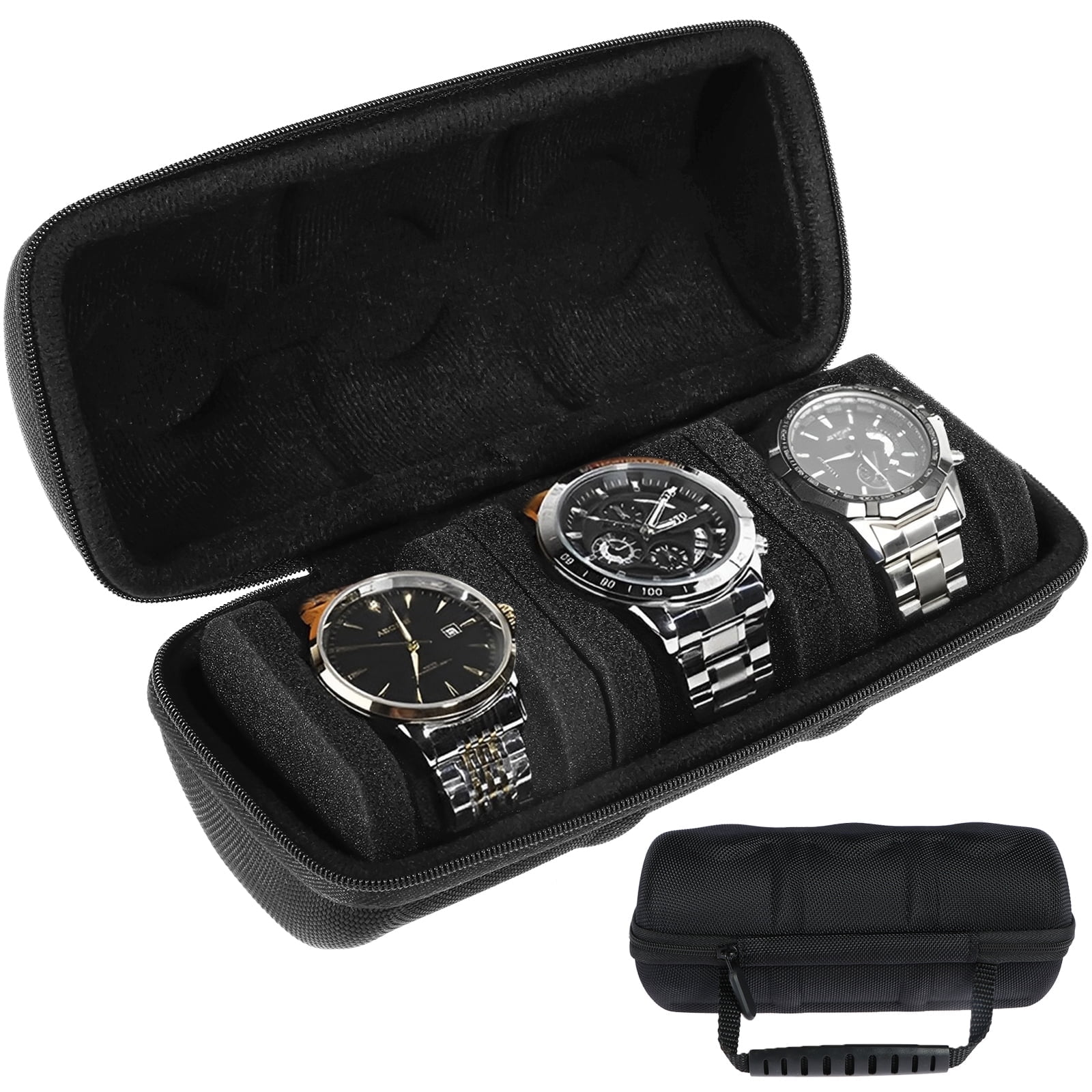 [Portable & Safe to Store Watches] This portable watch travel case holds and transports your watch securely in place, compact and sturdy with a stylish look, it is designed to protect your watch from moisture, dust and dirt. It also has 3 foam non-scratch watch pillows that provide a cushioned and secure environment for your watch, which prevents your watch from moving around or touching other watches during transportation.
