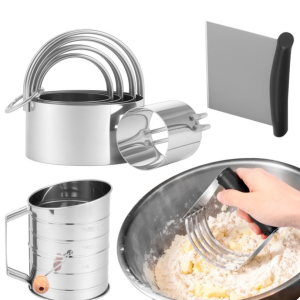 ??Comprehensive Baking Kit?? : Including 1 pastry scraper , 1 dough blender and 5 round cookie cutters of different sizes , the set meets all requirements from mixing and cutting to shaping . It’s suitable for making cookies , donuts , cakes , pies and dumplings , ideal for home baking