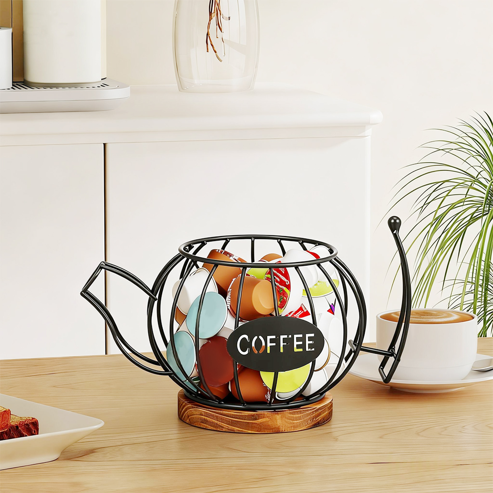 Txkrhwa Coffee Pod Holder Organizer, K Cup Holder Organizer with Wooden Base, Teapot Coffee Capsule Holder, Large Capacity Wire Coffee Storage Basket, Cafe Bar Organizer Accessories