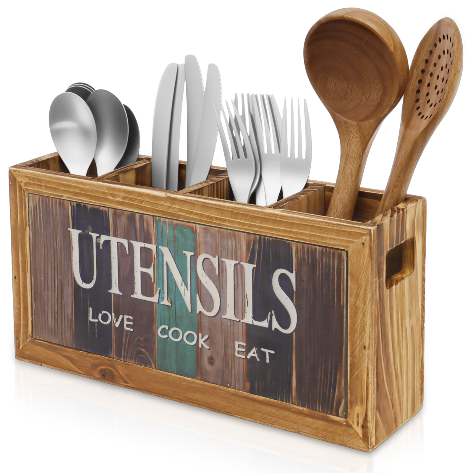 Tzdxfgl Wood Kitchen Utensil Holder for Countertop, 12″ Extra Large Silverware Organizer with 4 Compartments, Brown