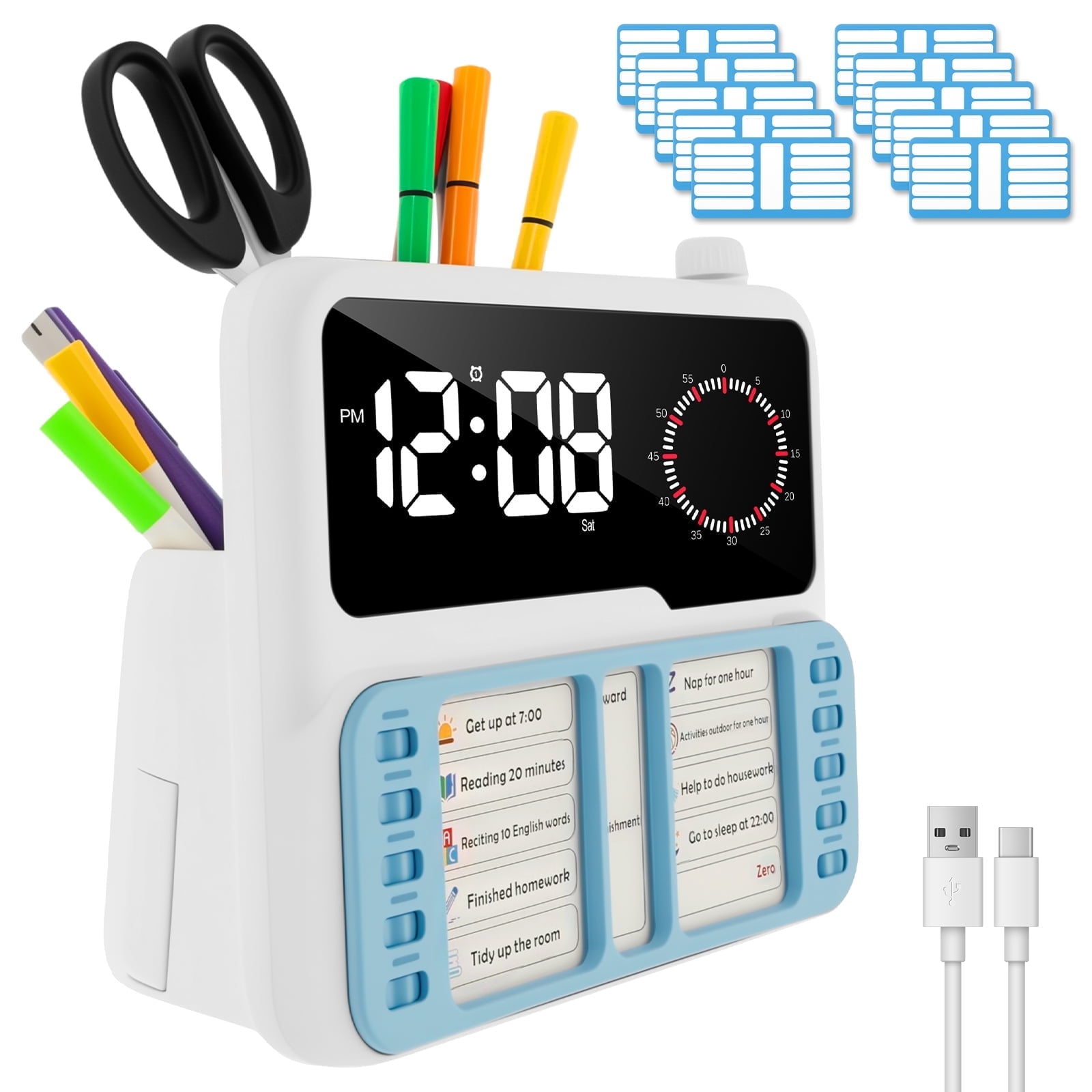 Description : This time manager integrates four core functions , displaying time , temperature and date . Equipped with dual alarms and a visual progress bar , it is suitable for special children and classroom management . Featuring an intelligent light sensor , voice encouragement and an interactive task system , it adopts a silent design , supports three timing modes and is easy to operate , with additional storage functions